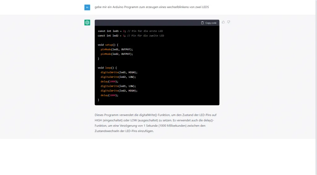 Wenn wir eine kleine Aufgabe haben, wie Bsp das Erstellen eines Arduino Programms zum Erzeugen eines Wechselblinkens zweier LEDs, dann können wir dieses als Anfrage an das System stellen und erhalten dann auch diesen Code.