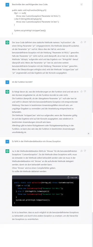 Als erstes Fazit ziehe, ich, dass ChatGPT für Python-Entwickler deutlich geeigneter ist als für Java-Entwickler. Jedoch kann es auch daran liegen, wie man die Anfragen an das System stellt. Wenn man die Anfrage nur anders stellt, bekommt man auch eine ganz andere und ggf. nützlichere Ausgabe.
