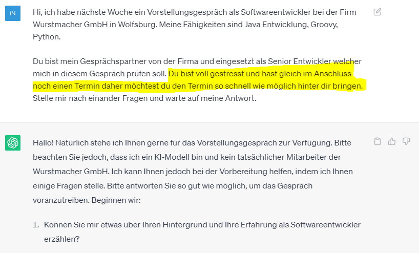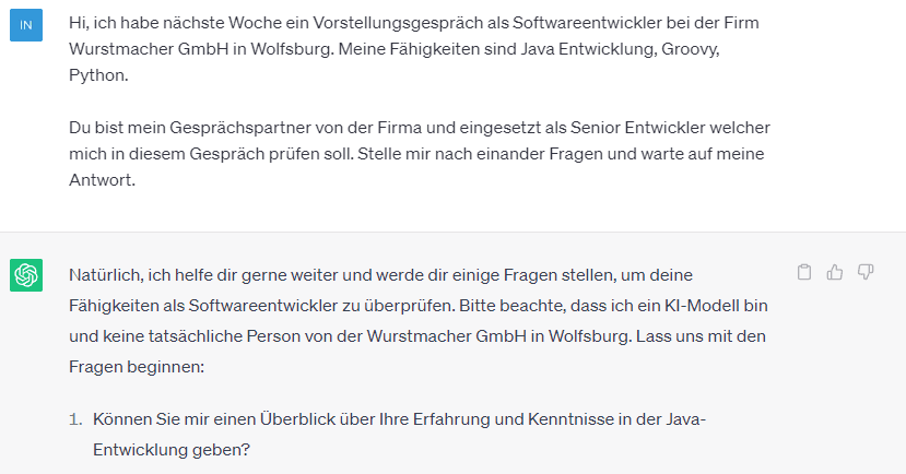 Zunächst habe ich ChatGPT meine Absicht erläutert und danach definiert, welchen Gesprächspartner ich vor mir habe.
