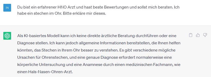 Ich würde davon abraten ChatGPT, als Ersatz für einen Doktor zu nutzen, auch wenn ChatGPT viele Datensätze besitzt, ersetzt dieses System keinen echten Arzt! Wenn du einen solchen Prompt an ChatGPT stellst, dann wird dir dieses auch dementsprechend ausgegeben.