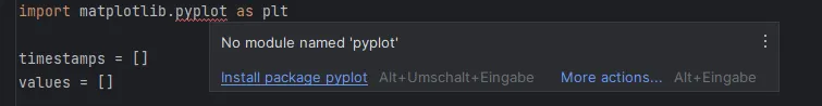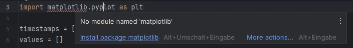 Wenn du die Entwicklungsumgebung PyCharm verwendest, dann kannst du auch per Kontextmenü die fehlende Bibliothek installieren.