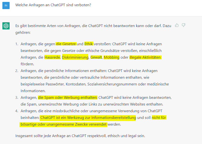 Wie oben bereits erwähnt beantwortet ChatGPT keine Anfragen, welche gegen Gesetze verstößt oder Gewalt fördern könnte.