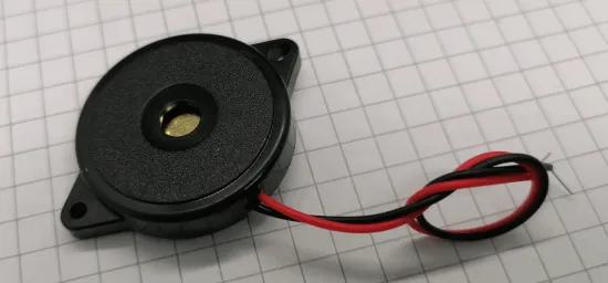 Der Piezolautsprecher verfügt über zwei, farbige Zuleitungen (rot & schwarz) mit einer Länge von 9 cm. Des Weiteren sind am runden Gehäuse (29 mm Durchmesser) zwei Montagelöcher von 2,5 mm angebracht.