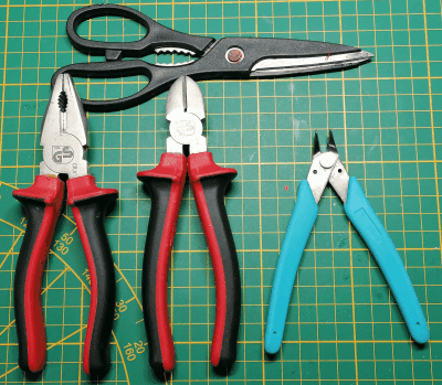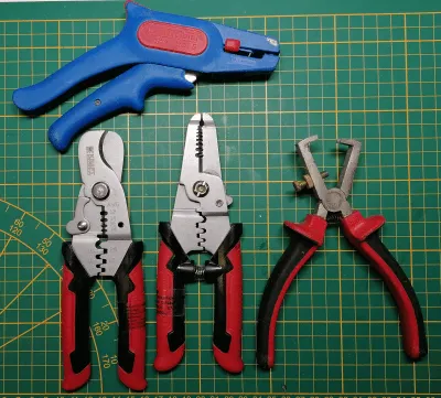 Zunächst müssen wir das Kabel in zwei kurze 5 cm Stücke schneiden. Hier kannst du einen kleinen Seitenschneider oder aber auch eine stabile Bastelschere verwenden. Die Enden der beiden Leitungen müssen nun noch abisoliert werden, hier gibt es diverse Zangen, welche dich dabei unterstützen können.