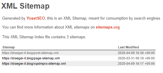 Die Datei sitemap_index.xml wird unter den Link https://<<ADRESSE>>/sitemap_index.xml bereitgestellt. Und beinhaltet wiederum jeweils nach Kategorie sortierte Listen. Je nach Webseite kann diese Liste mal länger oder kürzer sein.