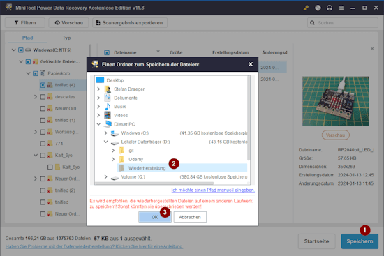 Die kostenfreie Version von MiniTool Data Recovery hat als Einschränkung jedoch, dass maximal 1 GB an Daten wiederhergestellt werden können. D.h. möchten Sie mehr als diese Beschränkung wiederherstellen, so benötigen Sie ein Upgrade.