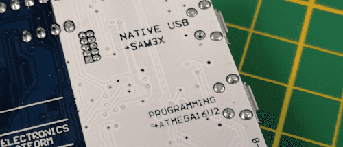 Um die MCU direkt zu programmieren, wird der Anschluss mit der Bezeichnung NATIVE USB SAM3X verwendet. Wenn eine Verbindung mit 1200 baud hergestellt wird, dann wird zunächst der interne Speicher über ein Soft-Erase geleert und der Mikrocontroller neu gestartet. Der Soft-Erase Prozess ist rein Softwarebasiert und kann ggf. auch abstürzen, wenn dieses geschehen ist dann hilft die kleine Taste „ERASE“ auf dem Board weiter.