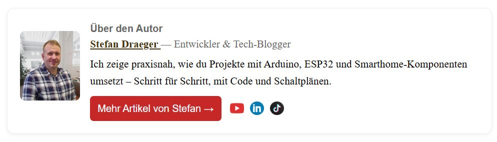 „Ich zeige praxisnah, wie du Projekte mit Arduino, ESP32 und Smarthome-Komponenten umsetzt – Schritt für Schritt, mit Code und Schaltplänen.“