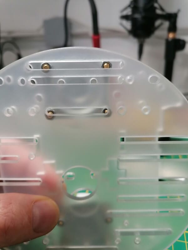Nachdem die Drehgelenke montiert wurden, werden die Abstandshalter für die obere Etage / Acrylplatte montiert. Das ist wichtig, denn im nächsten Schritt werden die Motoren montiert und dann kommst du nicht mehr so gut an die entsprechenden Löcher.