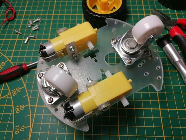 Bei der Montage der Motoren musst du darauf achten, dass die Lötpunkte nach außen zeigen, denn an diese musst du später noch die Kabel für die Stromversorgung anlöten.