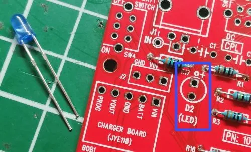 Bei der kleinen blauen, 3mm LED muss man auf die korrekte Polung achten, hier ist der Pol für die Kathode (das kurze Beinchen) ein kleines Rechteck als Lötauge aufgebracht.