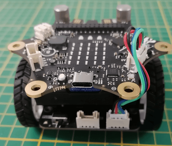 Was ich besonders cool finde, ist das dies alles über I2C gelöst ist und mit nur einem Kabel vom Calliope Mini an das Chassis gelöst ist!