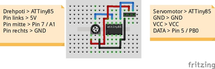 Wenn man das kleine Programm auf den ATTiny85 hochgeladen hat, sollte sich dann ein angeschlossener Servo über den Drehpotentiometer steuern lassen.