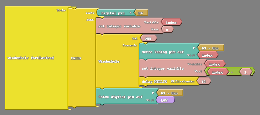 Wir können nun mit dem Taster Aktionen ausführen, wie zum Beispiel, das Starten einer Schleife und die Helligkeit der LED zu regeln.