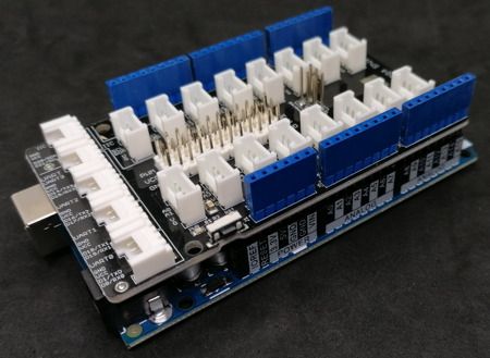 Für den Aufbau der Schaltung am Arduino verwende ich das Base Shield v2, auf welchem per Grove Verbinder die Sensoren / Aktoren angeschlossen werden können.