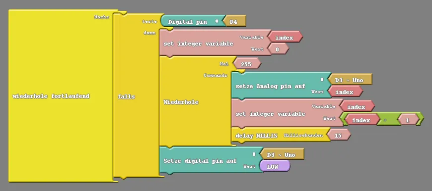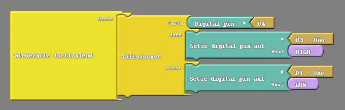 Der Code wird in einer Schleife ausgeführt und es wird dauerhaft der Status vom Pin D4 abgefragt. Wenn dieser WAHR ist, dann wird der Code im Abschnitt „dann“ ausgeführt, andernfalls der Abschnitt „sonst“.