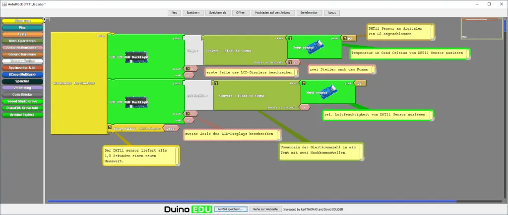 In diesem neuen Beitrag möchte ich dir gerne zeigen, wie du die Sensorwerte des DHT11 Sensors auf einem LCD-Display per DUINO EDU anzeigen lassen kannst.