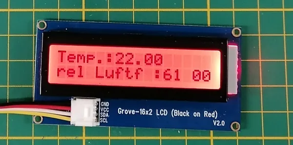 Die Schaltung ist mit den Grove Anschlüssen sehr einfach und schnell erledigt, denn das LCD-Display wird lediglich in einen I2C und der DHT11 Sensor in ein digitalen Connector gesteckt.