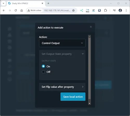 Wenn die Zeit eingestellt und die Schaltfläche „Weiter“ betätigt wurde, dann muss eine Aktion eingestellt werden. Dazu können wir entweder den Ausgang Ein/Aus Schalten oder umschalten.