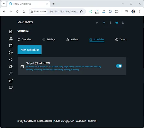 Es gibt wie immer mehrere Möglichkeiten, einen Verbraucher zeitgesteuert zu schalten. Zum einen über die App, mit einer Verbindung zur Cloud, via Script auf dem Shelly und extern via HTTP URL.