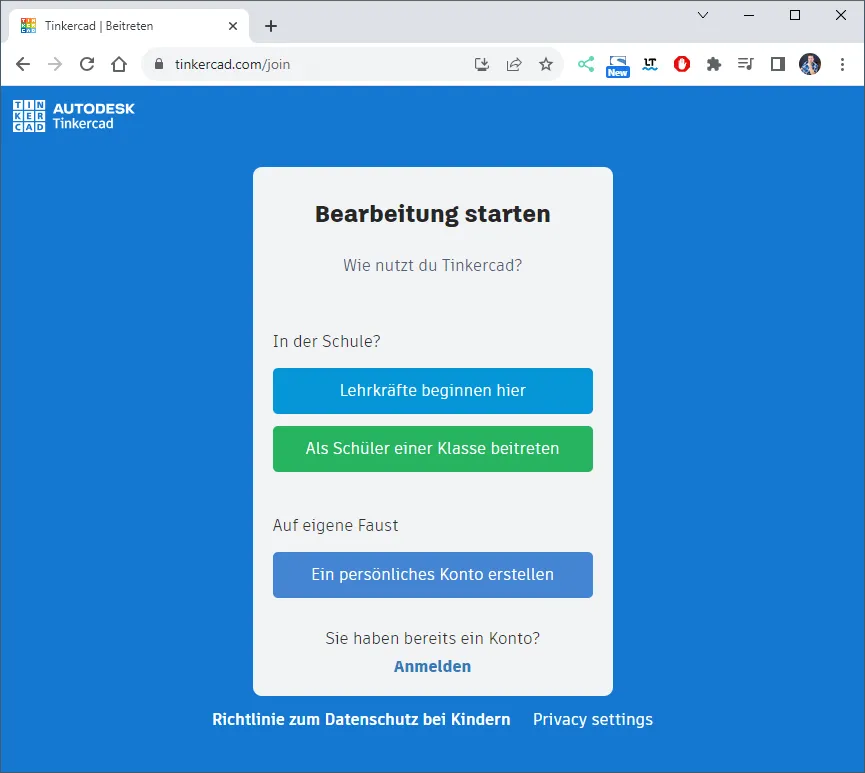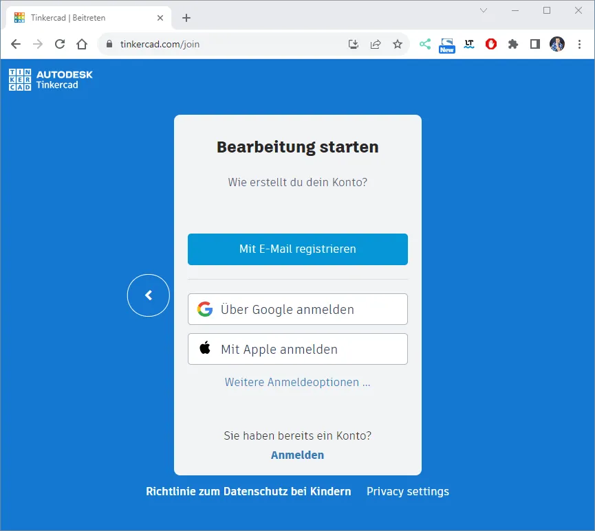 Damit du TinkerCAD verwenden kannst, musst du dir zunächst ein Konto anlegen. Dieses kannst du ein bestehendes Google oder Apple Konto machen. Oder du erstellst dir mit deiner E-Mail-Adresse ein eigenes Konto.