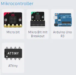 Im ersten Schritt wählen wir einen Mikrocontroller aus, hier kannst du zwischen einem BBC micro:bit, Arduino UNO R3 und ATtiny wählen.