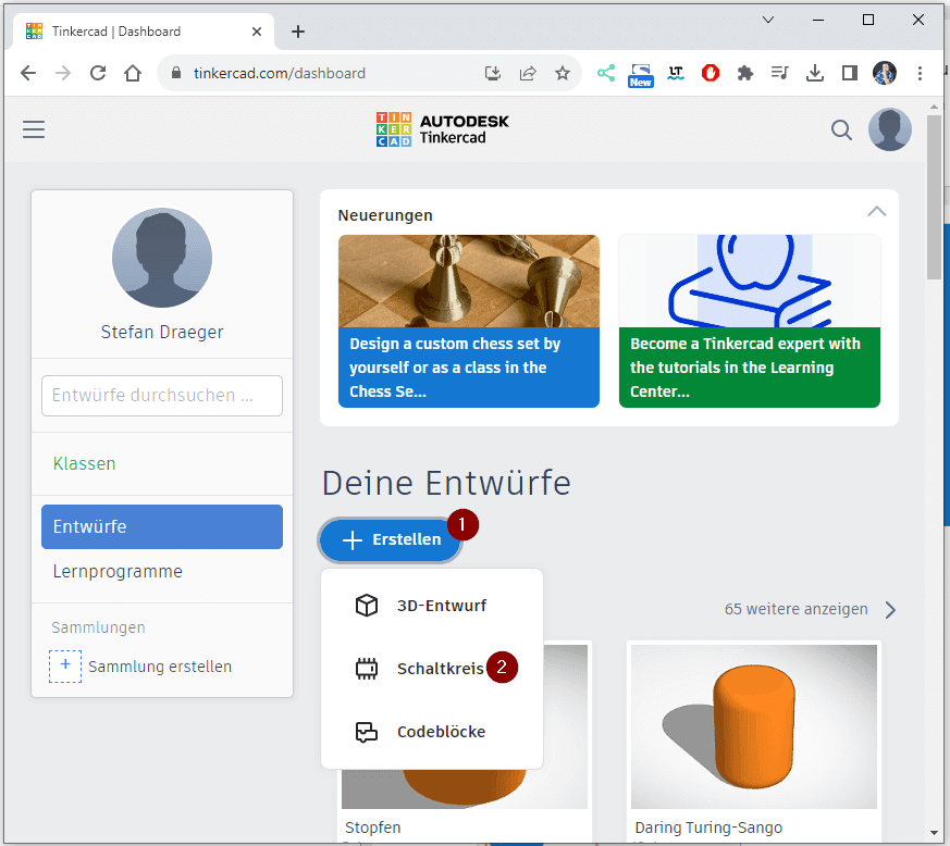 Wenn du angemeldet bist, dann kannst du über die Schaltfläche „Erstellen“ (1) aus dem Untermenü den Eintrag „Schaltkreis“ (2) wählen.