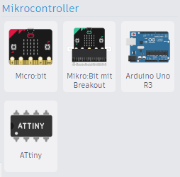 Im ersten Schritt wählen wir einen Mikrocontroller aus, hier kannst du zwischen einem BBC micro:bit, Arduino UNO R3 und ATtiny wählen.
