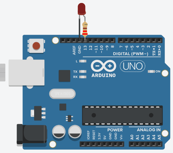 Die interne LED ist am digitalen Pin D13 angeschlossen und an diesen verbinden wir nun eine LED mit einem 220 Ohm Vorwiderstand.