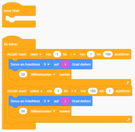 Nachfolgend ein kleiner Codeblock zum Drehen eines Servomotors von 1° bis 180° und zurück. (siehe obiges YouTube-Video)