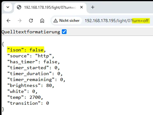 Die Lampe lässt sich durch eine Adresse aus dem Browser aktivieren und deaktivieren, dazu nutzen wir die Adresse http://192.168.178.195/light/0 und hängen den Parameter turn mit dem Wert off für AUS bzw. on für AN.