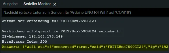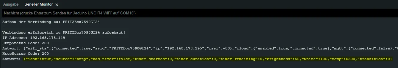 Auf der Seite UNO R4 WiFi Network Examples finden wir eine sehr ausführliche Dokumentation wie man am Arduino UNO R4 WiFi eine Http Anfrage absendet, jedoch war dieses für die Verbindung zum Shelly nicht möglich. Ich habe nach einigem experimentieren mit der Bibliothek vom GitHub Repositiory arduino-libraries/ArduinoHttpClient erfolgreich geschafft die Lampe zu steuern.