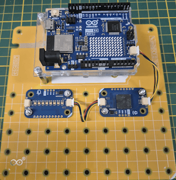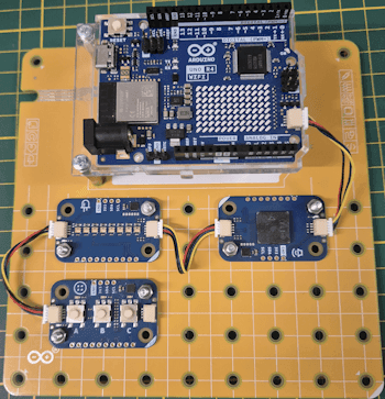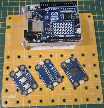 Der Aufbau des kleinen Einsteigerprojektes ist in drei wenigen Schritten erledigt. Da die Module über eine eindeutige Adresse verfügen kannst du diese auf der Modulino Base beliebig anordnen, du musst dich also nicht zu 100 % an diese Anleitung halten. Wichtig ist lediglich, dass diese mit dem Qwiic Kabel miteinander zum Arduino UNO R4 WiFi verbunden sind.