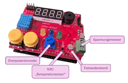 The Rich Shield from Open Smart includes several analog sensors that we can read and use for small projects: