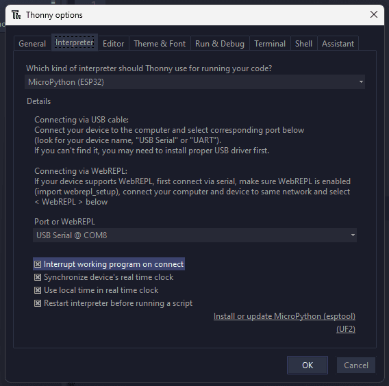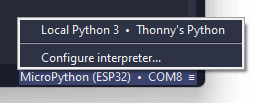 Then set the interpreter to “MicroPython (ESP32)” and the correct port.