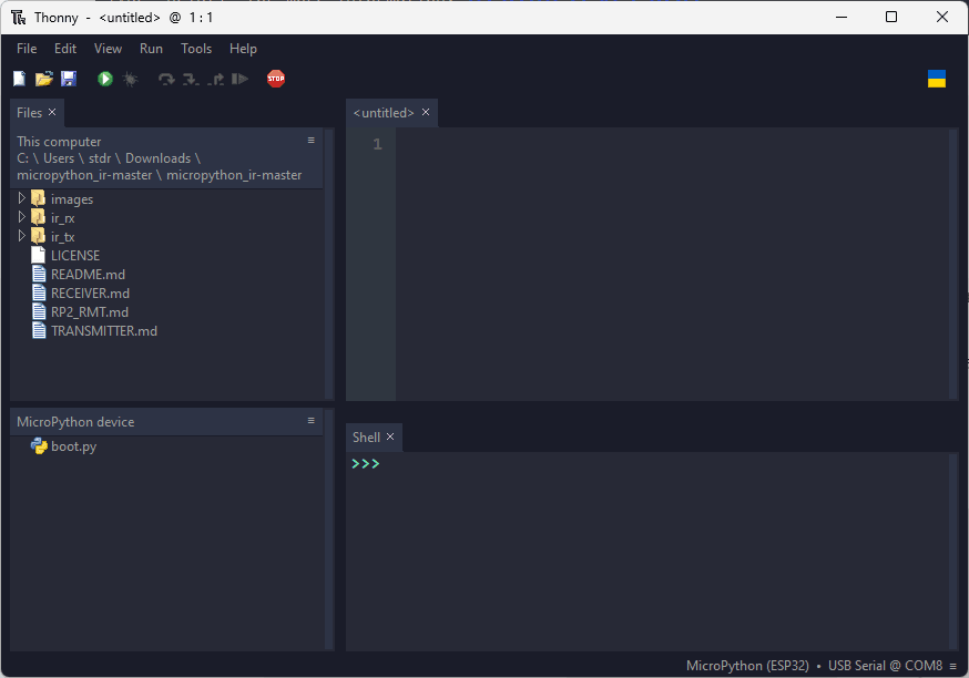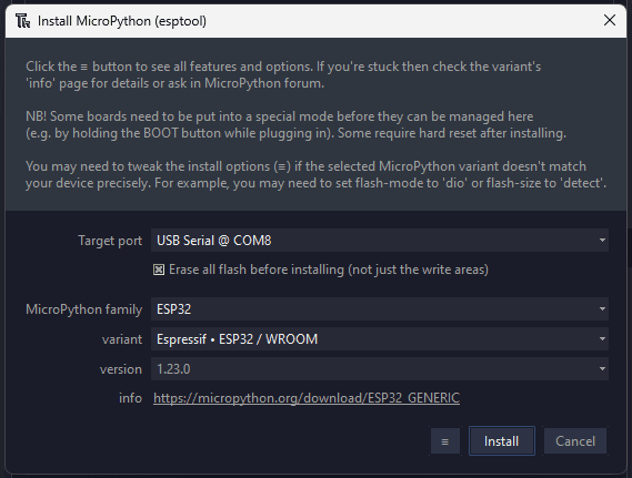 Finally, click on the “Install or update MicroPython (esptool)” link at the bottom right.