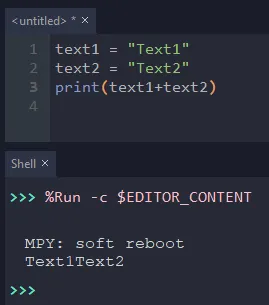 text1 = "Text1" text2 = "Text2" print(text1+text2)