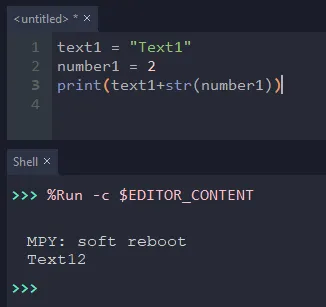 text1 = "Text1" number1 = 2 print(text1+str(number1))