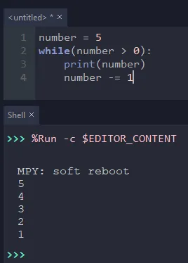 Within the while loop, the variable number is decreased by 1, and at the head of the loop, it is checked if this value is greater than 0. Once the value of the variable number reaches 0, the loop is broken.