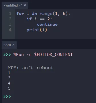 In the output, you see that the number 2 was skipped because we check in the code if the current index is equal to 2, and if so, the execution at this point is aborted.