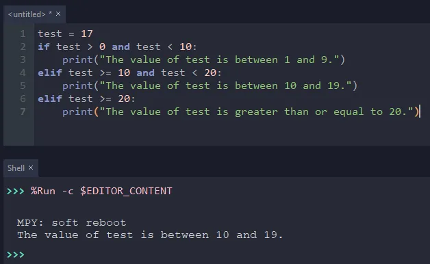 In this example, it is checked if the value of the variable test is between certain values or greater than or equal to 20.