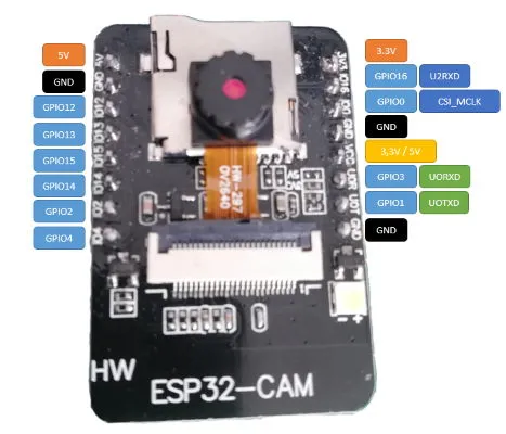 The microcontroller ESP32-CAM has 16 pins of an interface for the camera module and a SD card slot for Micro SD cards up to 4 GB.