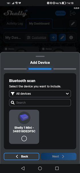 The easiest way is via Bluetooth, here you just have to search for Bluetooth devices in the Shelly Smart Control app. (In my case, I had to set the filter to ‘All devices’.) The Shelly 1 Mini is then displayed after a short time. Now we can add it, whereby we first configure the WiFi network. Once this has been done, the detailed view opens immediately.