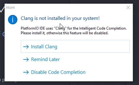 Das Tool Clang wird für die Codevervollständigung benötigt und kann unter den Link http://docs.platformio.org/en/latest/ide/atom.html#ii-clang-for-intelligent-code-completion heruntergeladen werden. Es gibt eine Version für MacOS sowie 2 für Microsoft Windows (32Bit, 64Bit).