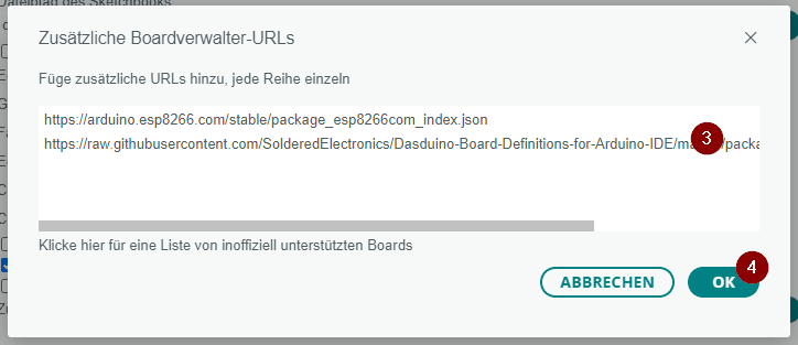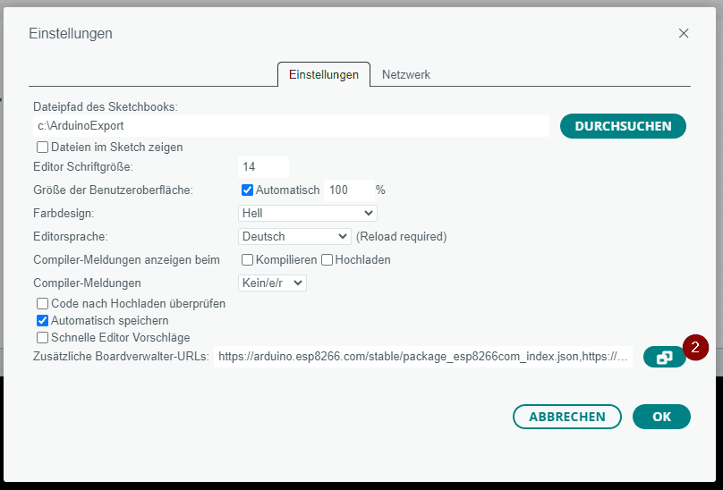 Im ersten Schritt installieren wir den Boardtreiber, dazu öffnen wir die Einstellungen unter Datei > Einstellungen und dort fügen wir die nachfolgende URL zu den zusätzlichen Boardverwalter URLs ein.
