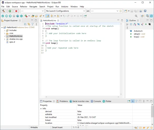 Wenn das Projekt fertig eingerichtet ist, so wird die ggf. bereits bekannte Struktur eines Arduino Sketches angezeigt.
