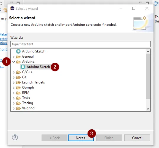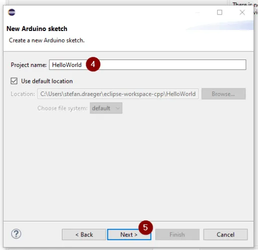 In dem Dialog „Select a Wizard“ öffnen wir den Knoten „Arduino“ (1) und dort wählen den Eintrag „Arduino Wizard“ (2) und betätigen die Schaltfläche „Next >“ (3). Im nun gestarteten Wizard geben wir zunächst den Projektnamen (4) und betätigen auch hier die Schaltfläche „Next >“ (5).