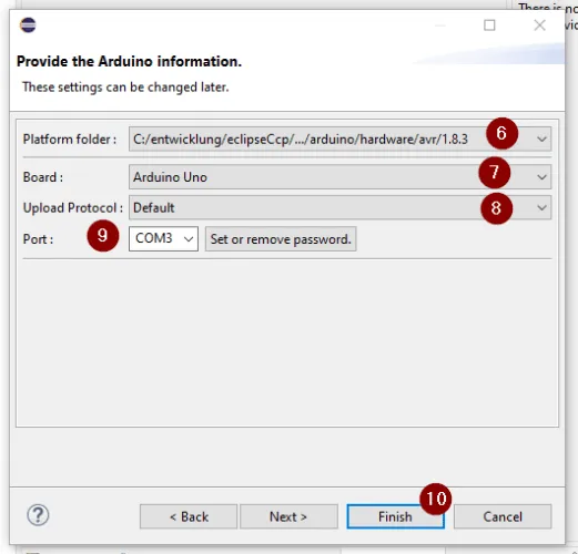 Diese Daten bestätigen wir nun mit der Schaltfläche „Finish“ (10) und es wird das Projekt eingerichtet.