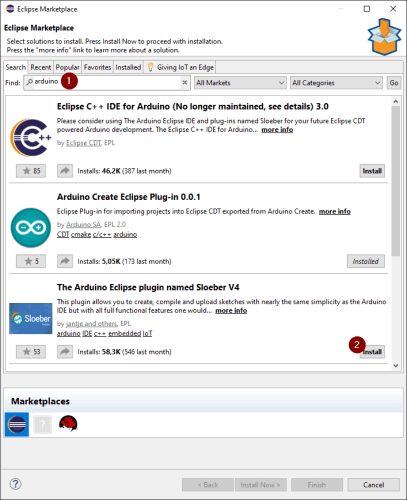 Das Plugin Sloeber bietet die Funktion ein Arduino Projekt in Eclipse zu erstellen und auf den Microcontroller zu kopieren. Um dieses nützliche Plugin kannst du aus dem Eclipse Marketplace laden. Dazu suchst du zunächst nach dem Schlagwort „arduino“ (1) und wählst dann die Schaltfläche „install“ (2) beim Eintrag „The Arduino plugin named Sloeber V4.0“.