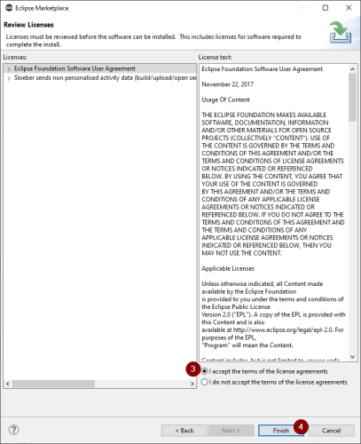 Im nächsten Dialog musst du den Lizenzvertrag zustimmen (3) (damit das Plugin installiert werden kann) und die Schaltfläche „Finish“ (4) betätigen.
